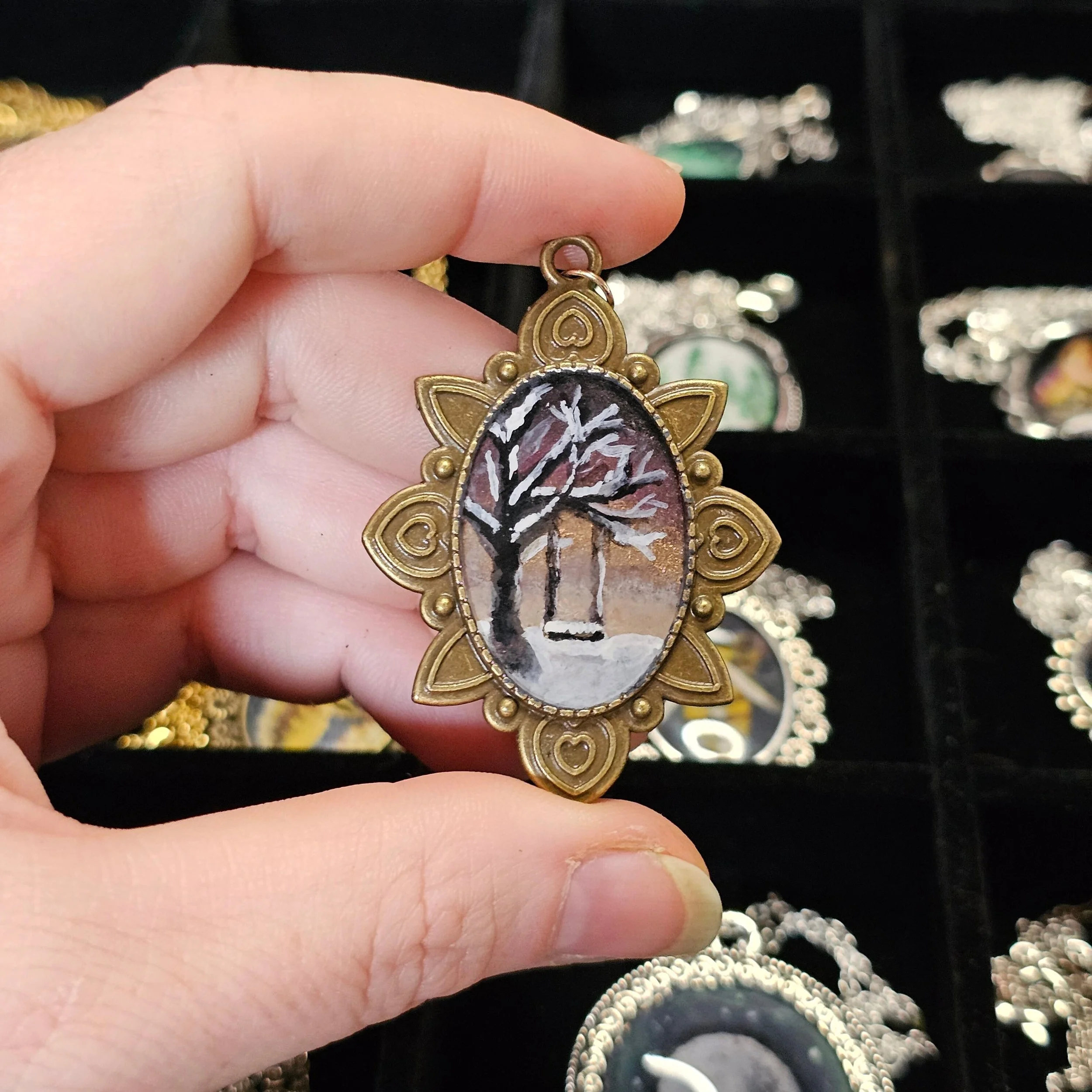 KinzyX › Hand painted necklace- Winter Tree Swing Image 1 of 2 Image 2 of 2 Hand painted necklace- Winter Tree Swing $75.00 This is a hand painted necklace with acrylic paint, sealed with UV Resin. Hypoallergenic chain made of stainless steel. Add To Cart Added! This is a hand painted necklace with acrylic paint, sealed with UV Resin. Hypoallergenic chain made of stainless steel.